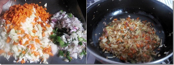 • Chop all the vegetables very finely..Take a wide mouthed kadai with 2tbsp of oil and add the onions & garlic pieces.Saute for sometime.Then add vegetables.